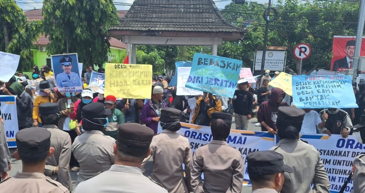 Aksi ini dilakukan warga terkait proses persidangan perkara tindak pidana Kepala Desa (Kades) Pematang Panggang, Ibrahim bin Hasan, yang didakwa menggunakan ijazah palsu.