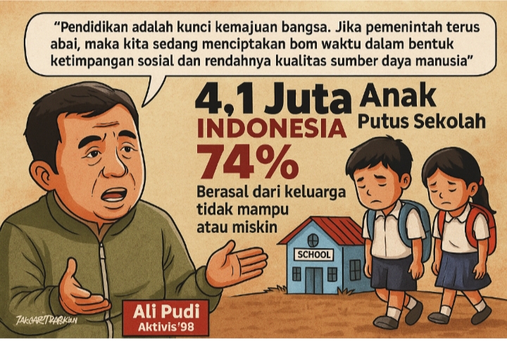 Mediatrapnews,Jakarta — Sebanyak 4,1 juta anak Indonesia terpaksa putus sekolah, dengan 74 persen di antaranya berasal dari keluarga tidak mampu. Kondisi ini menjadi sorotan serius dari aktivis 98, Ali Pudi, yang menilai pendidikan di Indonesia masih jauh dari kata layak.