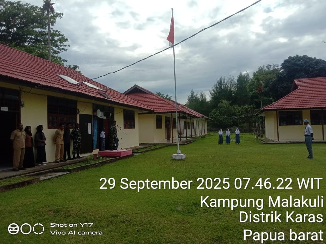 Mediatrapnews, Fakfak Papua Barat – Babinsa Koramil 1803-04/Karas, Sertu Asmin Daeng, tampil sebagai pembina upacara bendera di SMA Negeri Karas, Jalannya Pendidikan, Kampung Malakuli, Distrik Karas, Kebupaten Fakfak, pada Senin (29/9/2025).