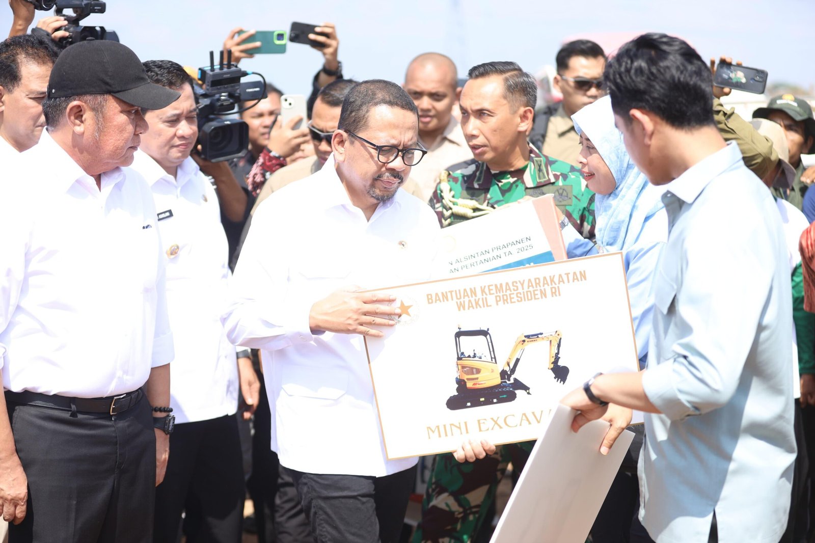 Kegiatan ini juga dimeriahkan dengan penyerahan dua unit ekskavator dari Wapres Gibran untuk kelompok tani, sebagai dukungan mekanisasi pertanian.