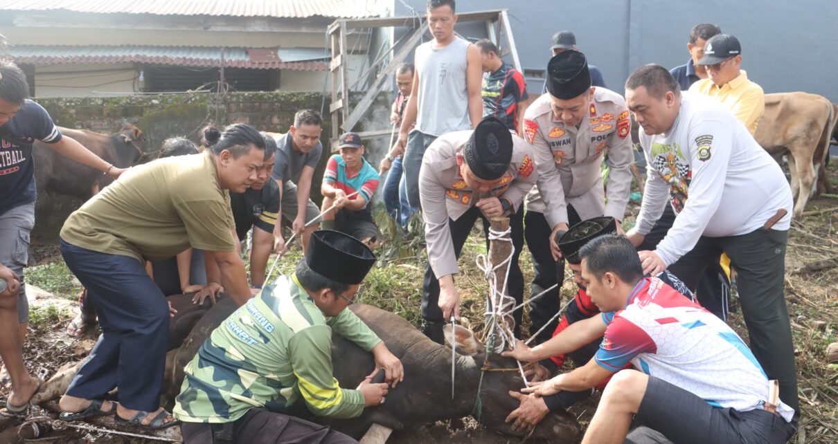 Kapolres lahat melakukan langsung Propesi Penyembelian Hewan Korban dalam rangka Idul Adha di halaman Masjid Al Muflihun Aspol Bandar Agung lahat