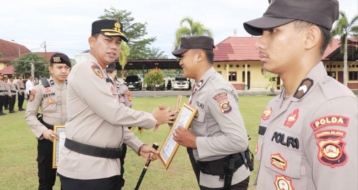 MUSI RAWAS – Kapolres Musi Rawas (Mura), AKBP Agung Adhitya Prananta SH, SIK, MH, memimpin langsung Apel Pemberian Piagam Penghargaan Personel dari Kapolres Mura, dihalaman apel Mapolres Mura, Kecamatan Muara Beliti, Kabupaten Mura, Selasa (15/7/2025).