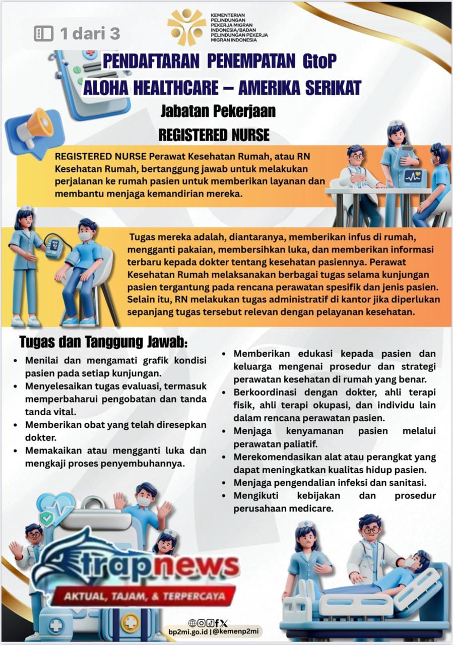 MEDIA TRAPNEWS ID-MUBA – Kabar menggembirakan bagi tenaga kesehatan khusus para perawat yang ingin mencoba kerja Amerika Serikat. Pemerintah Kabupaten Muba, melalui Dinas Tenaga Kerja dan Transmigrasi (Disnakertrans), kolaborasi bersama BP2MI membuka pendaftaran untuk penempatan tenaga kerja perawat profesional (Registered Nurse/RN) ke Amerika Serikat, bekerja sama dengan Aloha Healthcare.