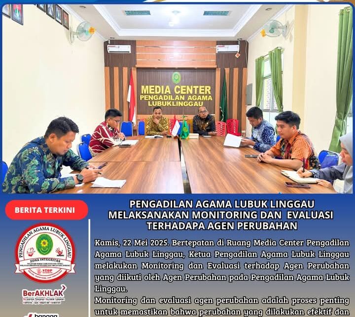Dengan monitoring dan evaluasi ini diharapkan dapat mengoptimalkan agen perubahan yang berperan dalam memfasilitasi dan mengelola perubahan. Mereka harus memiliki kemampuan untuk Membangun kepercayaan publik atas Peradilan Agama Lubuk Linggau dan kredibilitas Aparatur PA Lubuk Linggau, lebih jauh dengan monitoring dan evaluasi yang efektif, agen perubahan dapat memastikan bahwa perubahan yang dilakukan berhasil dan berkelanjutan.(Kens)