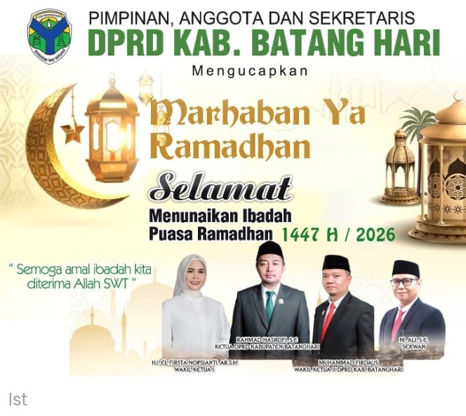Mediatrapnews, Batang Hari – Pimpinan dan Anggota Dewan Perwakilan Rakyat Daerah (DPRD) Kabupaten Batang Hari Mengucapkan Marhaban Ya Ramadhan. Selamat Menunaikan Ibadah Puasa 1447.H/2026.M Semoga Bulan Suci Ini Membawa Kedamaian dan Keberkahan Bagi Kita Semua. Taqqabalallah Mina Wa Minum Al-Siyam Wa Al-Qiyam