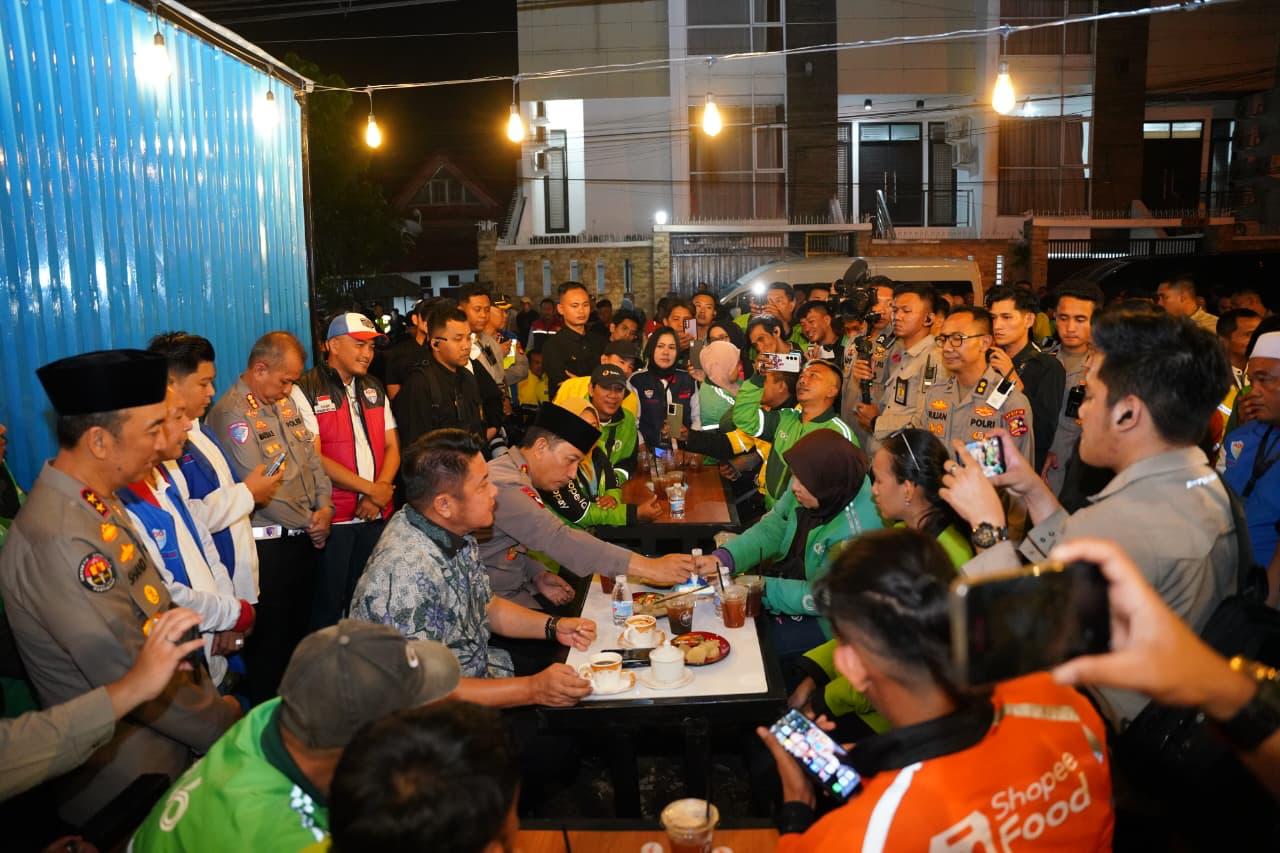 Mediatrapnews, Palembang – Gubernur Sumatera Selatan (Sumsel) Dr. H. Herman Deru bersama Kepala Kepolisian Negara Republik Indonesia (Kapolri) Jenderal Polisi Listyo Sigit Prabowo bersilaturahmi dan bercengkerama dengan para anggota Asosiasi Driver Online (ADO) di Kedai Presisi ADO Palembang, Sabtu (7/3/2026).