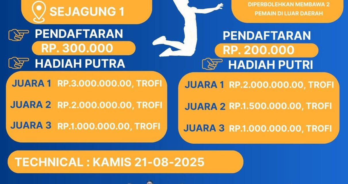 Ajang ini dijadwalkan berlangsung pada Minggu, 24 Agustus 2025, bertempat di lapangan voli Desa Sejagung 1. Pendaftaran peserta telah dibuka sejak 13 Agustus 2025 dan akan berakhir 21 Agustus 2025. Antusiasme peserta dari berbagai dusun terlihat tinggi, baik di kategori putra maupun putri.