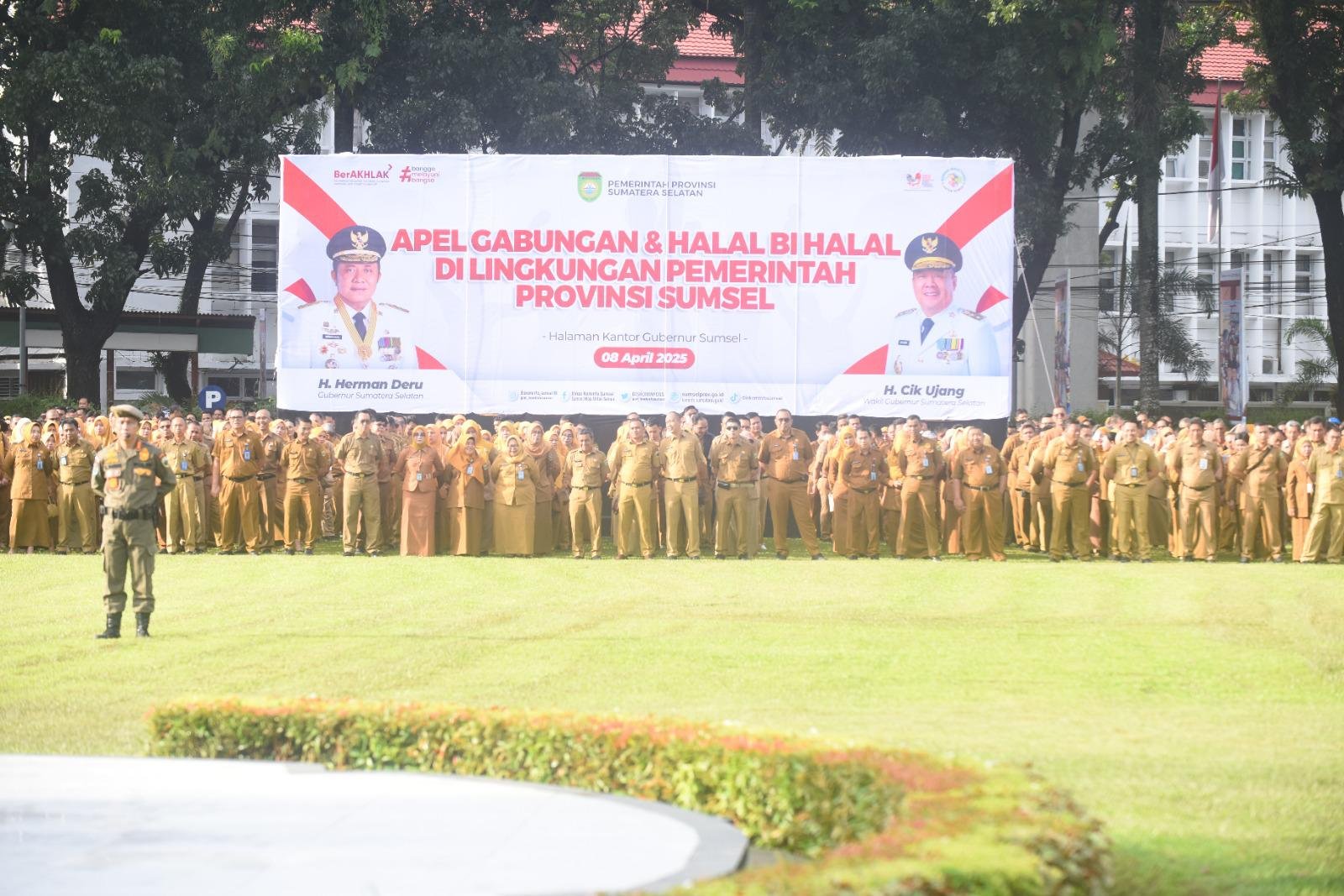 Mediatrapnews, Palembang – Wakil Gubernur (Wagub) Sumatera Selatan (Sumsel) H Cik Ujang memimpin apel gabungan dan halal bihalal bersama ratusan ASN dan Non ASN dilingkungan Pemerintah Provinsi (Pemprov) Sumsel di hari pertama masuk kerja pasca libur dan cuti bersama hari raya Idul Fitri 1446 Hijriah, bertempat di Halaman Kantor Gubernur Sumsel Jalan A. Rivai Palembang, Selasa (08/04/2025).