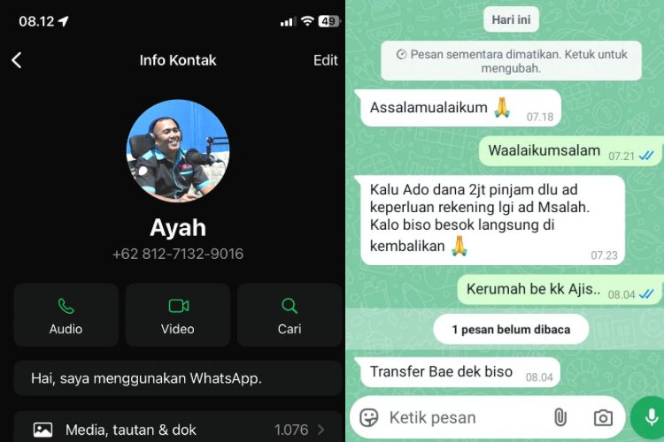 Mediatrapnews, Ogan Komering Ilir –Nomor WhatsApp milik Pimpinan Redaksi (Pimred) Ogan Post Abdul Aziz, 0812-7132-9016, telah diretas oleh pihak yang tidak bertanggung jawab. Nomor tersebut disalahgunakan untuk melakukan aksi penipuan dengan modus meminta pinjaman uang sebesar Rp.2 juta kepada sejumlah kontak yang ada di dalamnya.