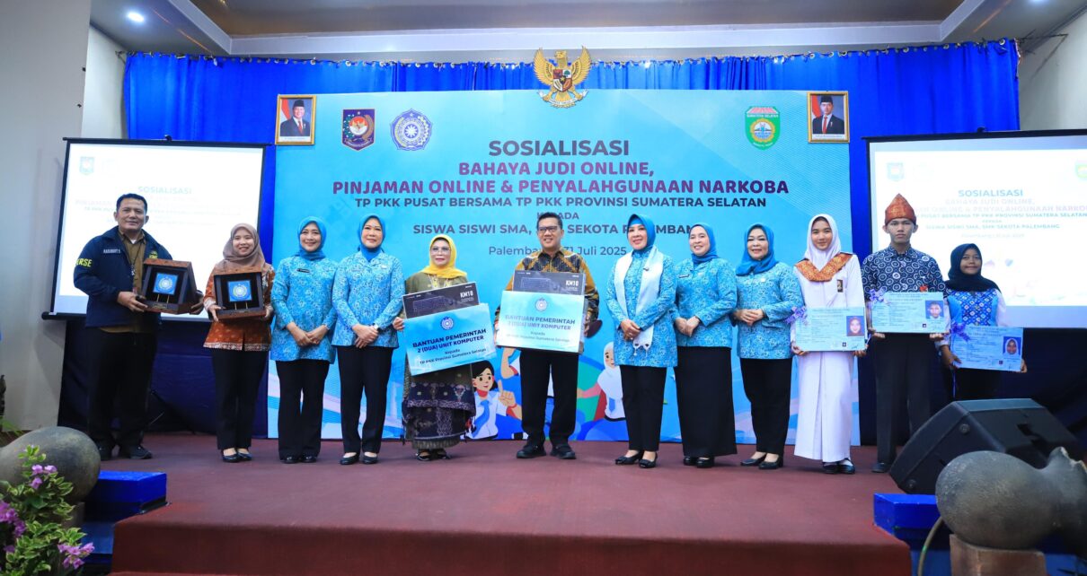 Mediatrapnews, Palembang – Tim Penggerak Pemberdayaan dan Kesejahteraan Keluarga (TP PKK) Provinsi Sumatera Selatan (Sumsel) bersinergi dengan TP PKK Pusat untuk mensosialisasikan bahaya narkoba, judi online, dan pinjaman online. Kegiatan ini digelar di SMK Negeri 6 Palembang, Rabu (31/7/2025), dengan melibatkan ratusan pelajar sebagai peserta.